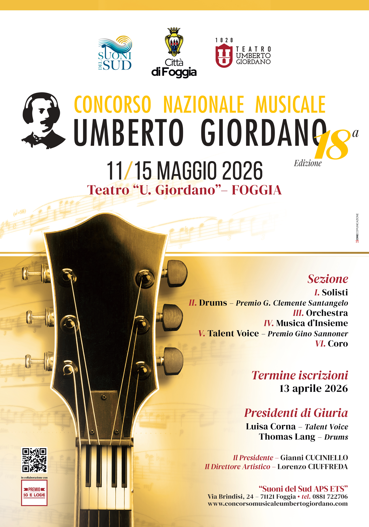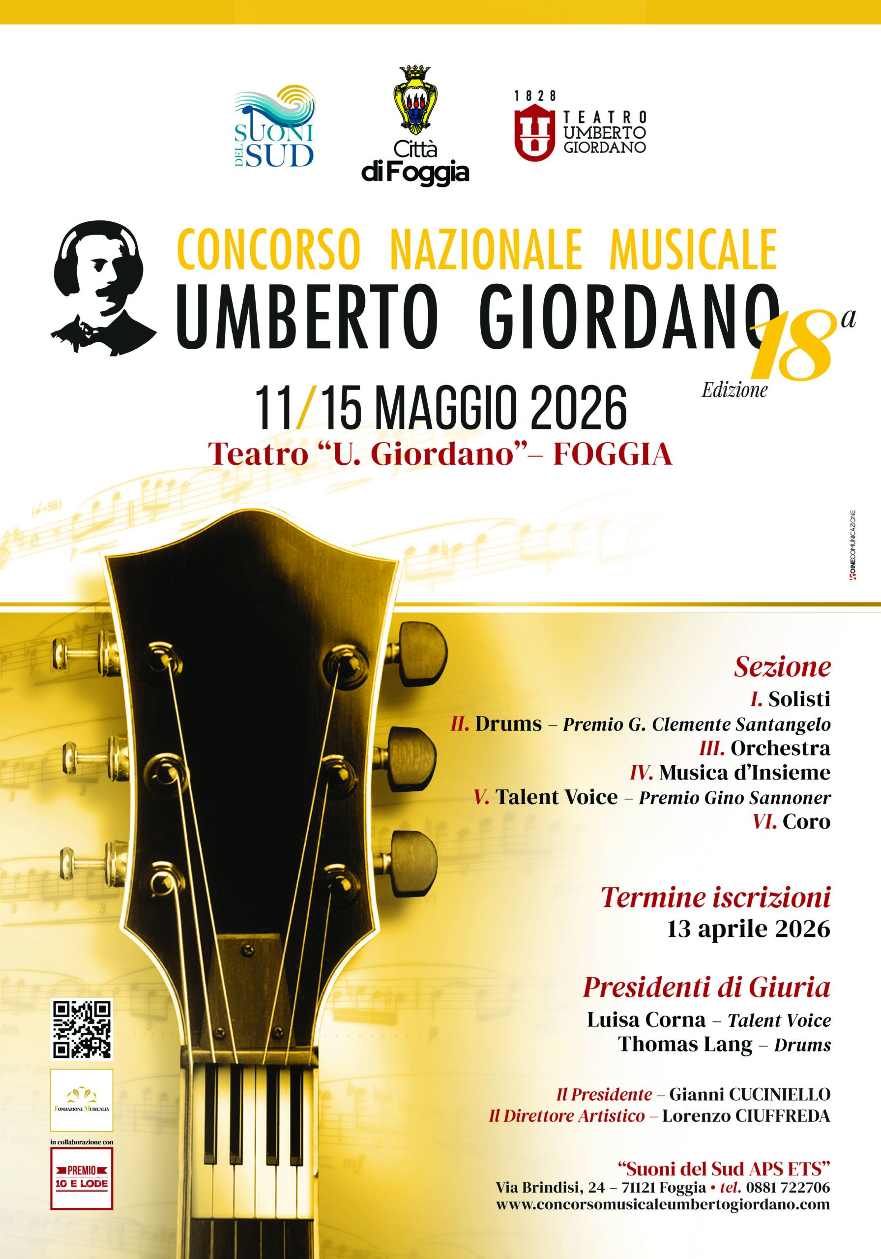 Tra le numerose iniziative promosse spicca l’istituzione del Concorso Nazionale Musicale “U. Giordano”, rivolto a tutte le realtà musicali. Il contest, ideato nel 2009 da Lorenzo Ciuffreda e Gianni Cuciniello, ha conseguito risultati straordinari fin dalla sua prima edizione, svoltasi a Foggia, che ha riscosso un lusinghiero successo nonostante le difficoltà legate alla complessità dell’organizzazione.